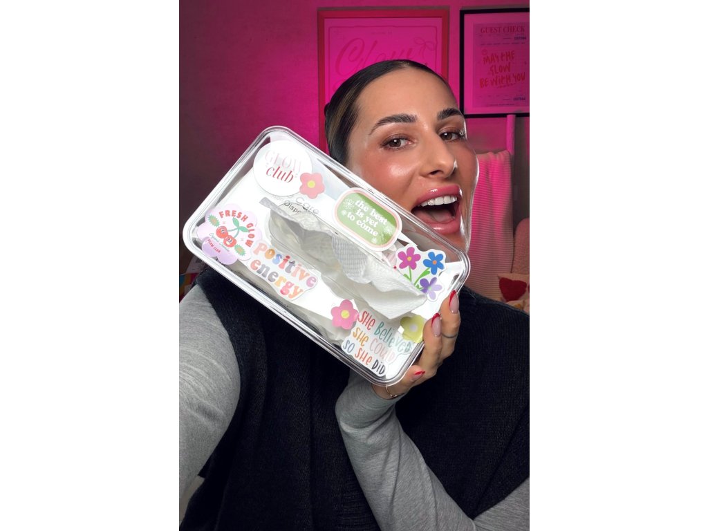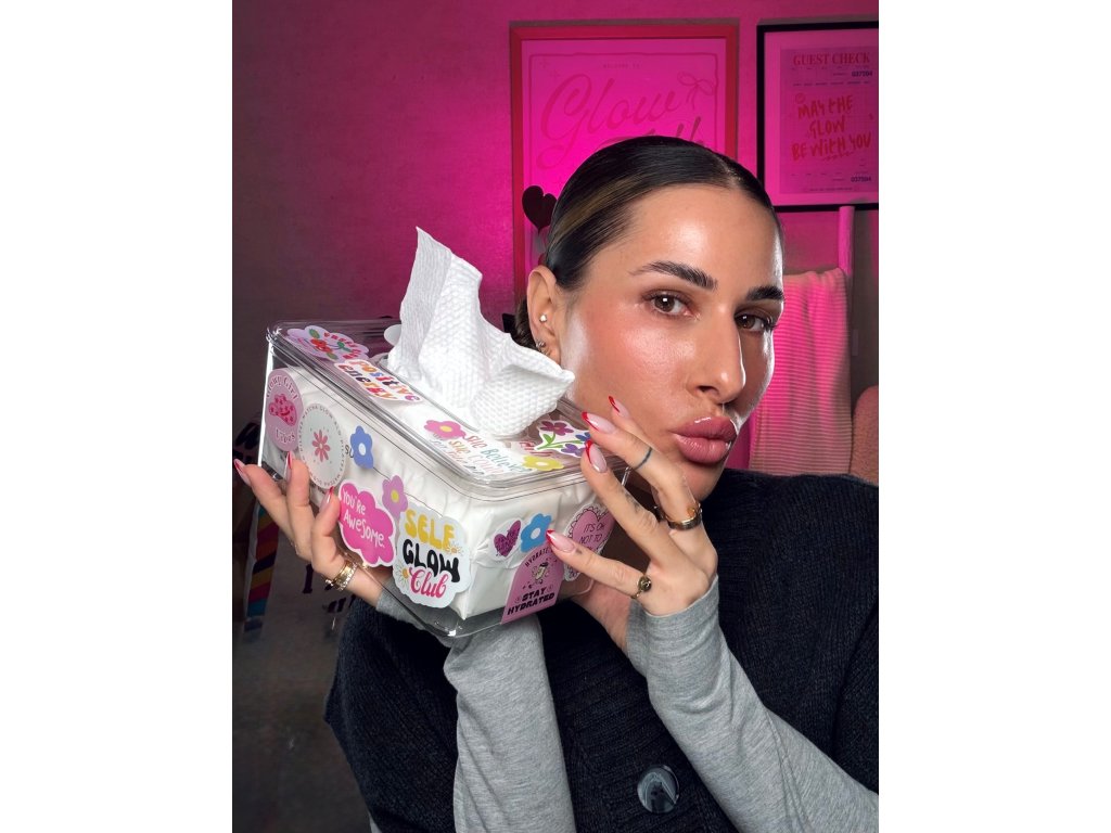 Jednorazové utierky na tvár z viskózy z prírodnej celulózy (regenerované rastlinné vlákno). Súčasťou setu je elegantný akrylový box na ich uloženie a 10 ks náhodných dekoratívnych nálepiek na personalizáciu.